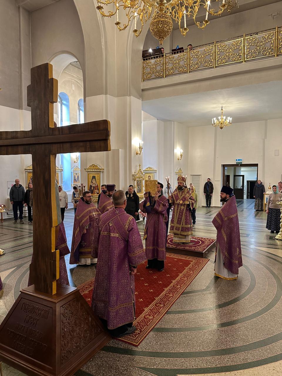 По окончании Литургии Архипастырь и духовенство совершили славление и поклонились Кресту Господню.