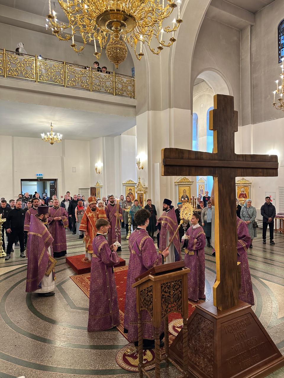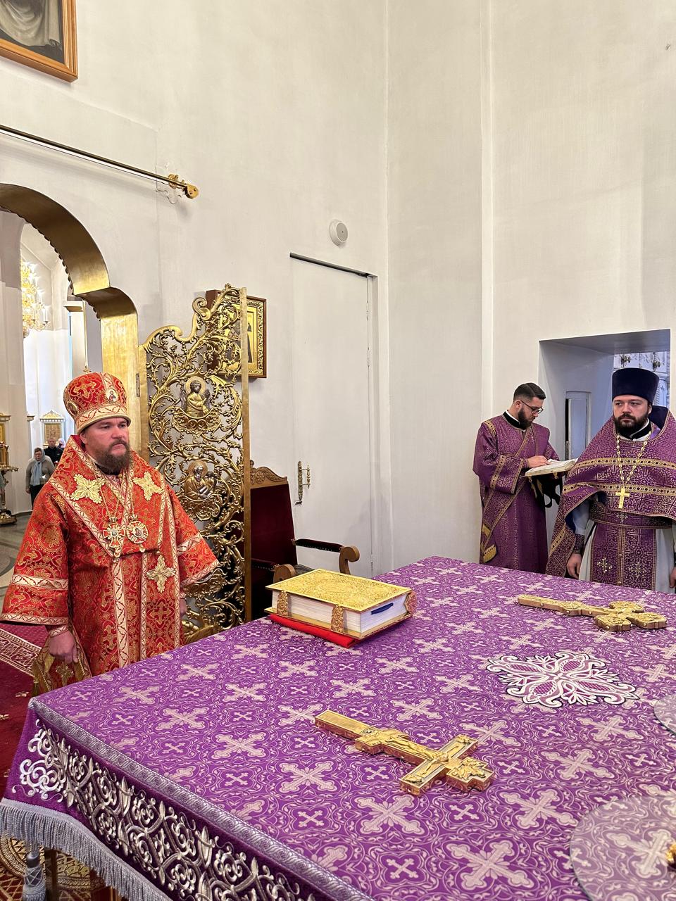 По окончании Литургии Архипастырь и духовенство совершили славление и поклонились Кресту Господню.