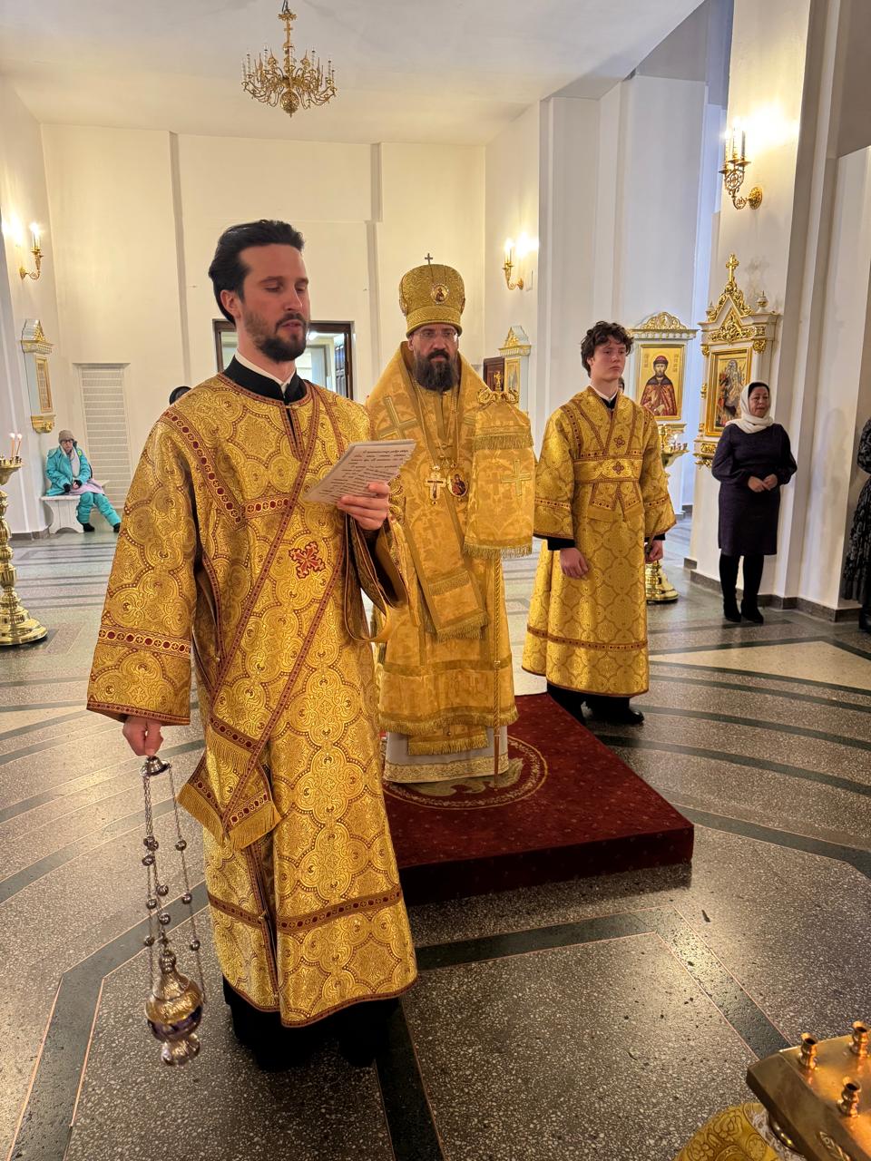 Его Преосвященству сослужили секретарь Норильской епархии, настоятель кафедрального собора иконы Божией Матери «Всех скорбящих Радость» г. Норильска иеромонах Герман (Мельников) и руководитель отдела Норильской епархии по делам молдодежи, благочинный кафедрального собора г. Норильска иерей Димитрий Прохоров.