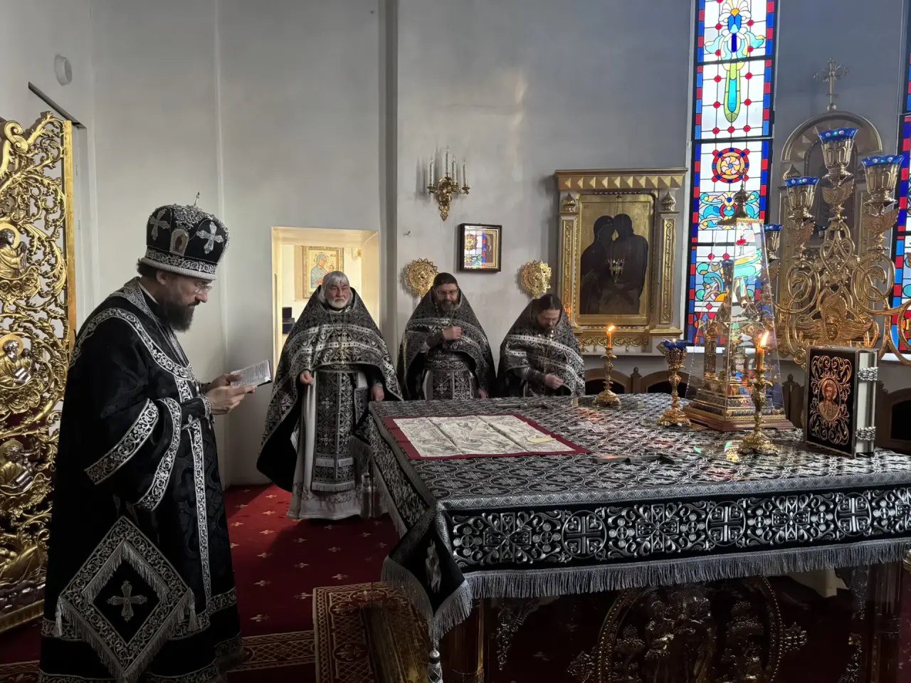 27 февраля 2026 года, в пятницу первой седмицы Великого поста, день памяти равноапостольного Кирилла, учителя Словенского, Преосвященнейший Агафангел, епископ Норильский и Туруханский, молился за великопостными утреней, часами и изобразительными в кафедральном соборе иконы Божией Матери «Всех скорбящих Радость» города Норильска. Затем Архипастырь совершил Литургию Преждеосвященных Даров.