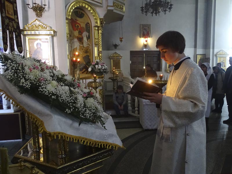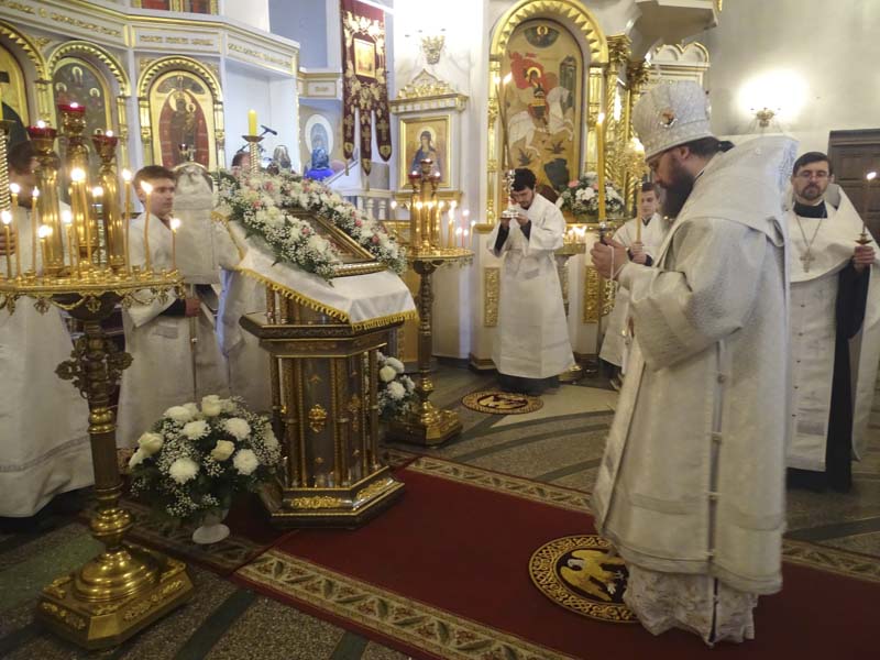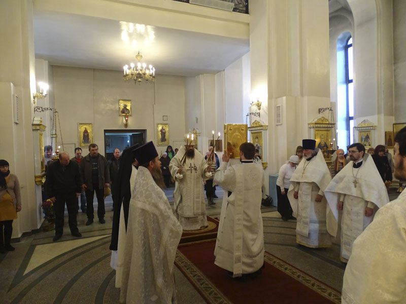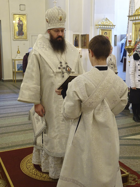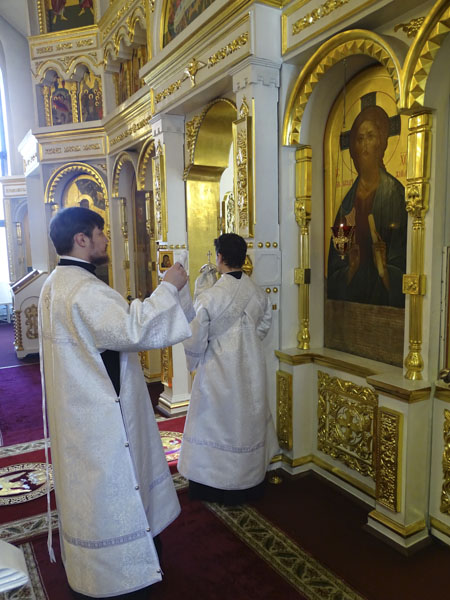 Его Преосвященству сослужили: секретарь Норильской епархии иеромонах Герман (Мельников); благочинный Норильского округа протоиерей Владимир Иванов; руководитель епархиального отдела по взаимодействию с силовыми структурами протоиерей Димитрий Харцыз; штатный клир собора.