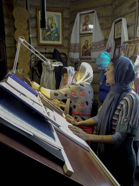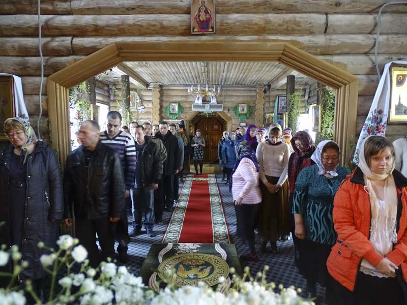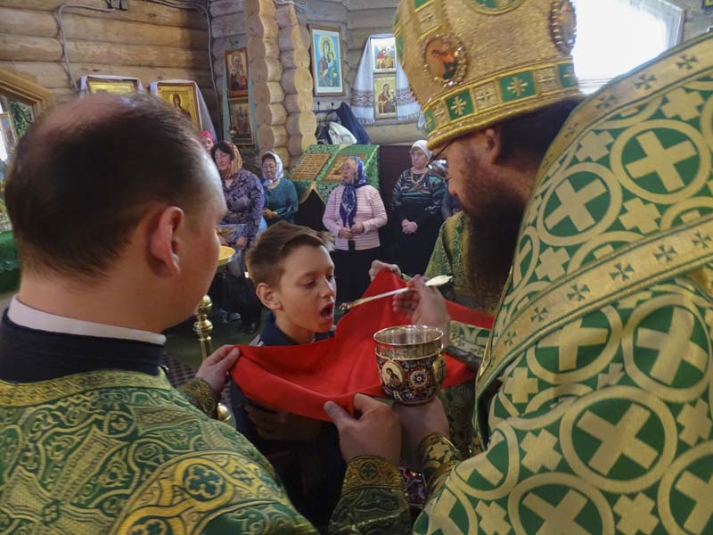 В честь праздника весь храм стараниями прихожан утопал в зелени и цветах, а вокруг храма тундра, покрытая сплошным снежным покровом. Особенно поразил всех огромный букет из распустившейся березы вокруг главной иконы праздника и зеленая трава, бережно разложенная на солее. Такой подарок любимому храму сделали прихожане, которые в день храмового праздника оказались на материке. Спасибо почте, приняла к перевозке необычный груз!