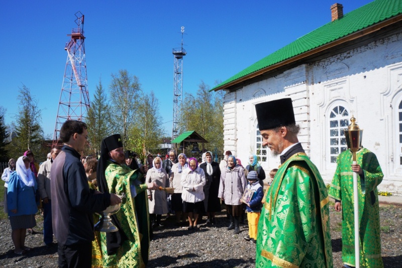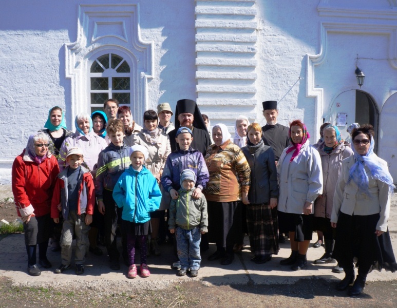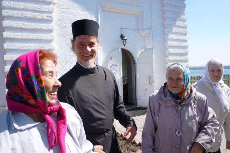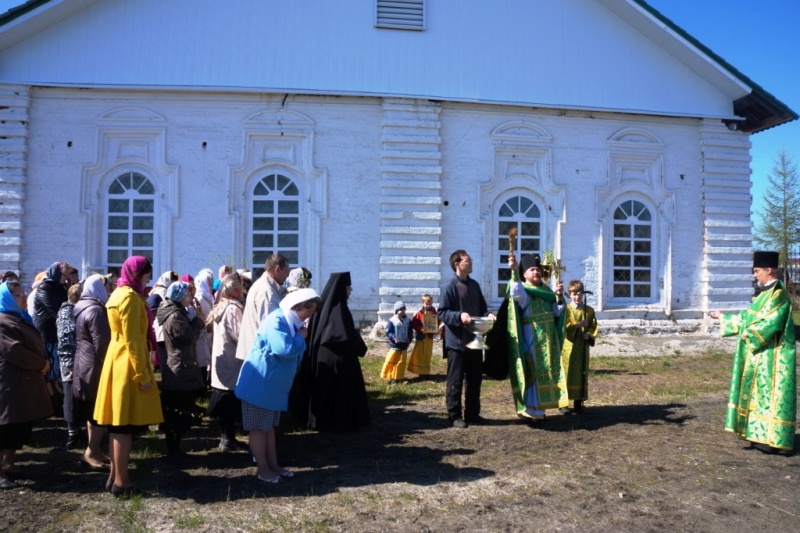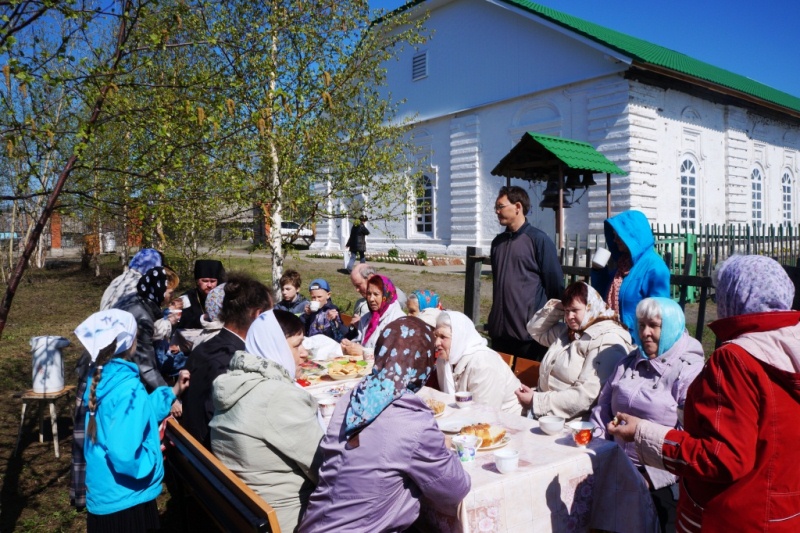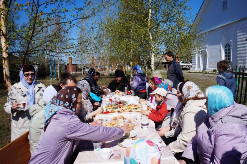 Туруханск – юг Норильской епархии, поэтому в отличие от далекого Норильска здесь уже сошли снега и на березах проклюнулись листья, поэтому прихожане устроили уже ставшее многолетней традицией чаепитие под березами, растущими прямо у входа в храм.