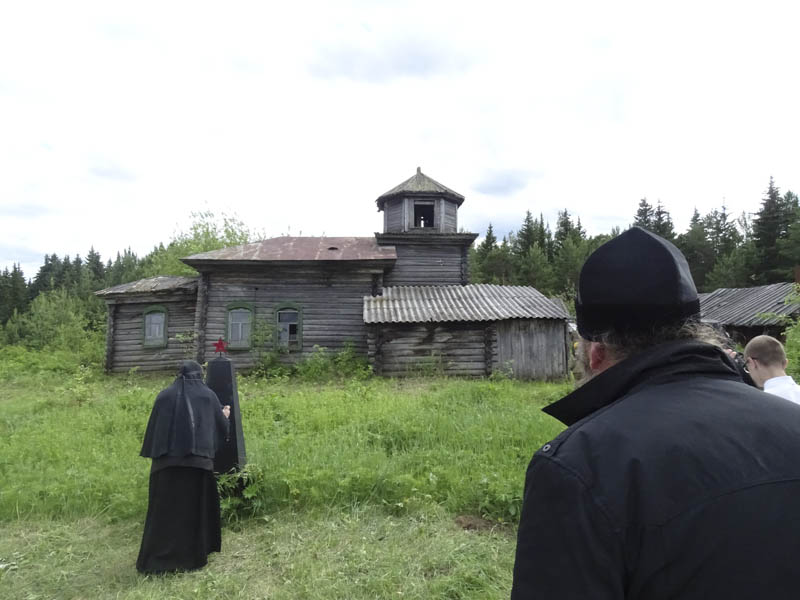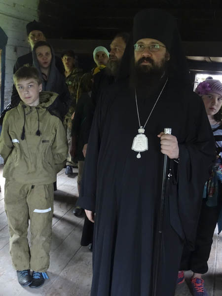 А затем все пошли к старинному храму, которой сохранился после ликвидации деревни Комса. Храм предположительно построен в XIX веке и руководство заповедника согласно возглавить работы по его восстановлению и изучению как памятника архитектуры. Директор заповедника П.В. Кочкарев рассказал о планах реставрации и просил о том, чтобы здание храма, которое сегодня является бесхозным строением, было принято епархией в состав его церковных строений. Владыко и сопровождающие его священники осмотрели церковь и совершили первое за много десятилетий в этом храме богослужение. Небольшой храм заполнили взрослые и дети, которые уже успели потрудиться на благо его возрождения. Чего стоят только огромное количество мешков мусора, вынесенного из помещения! Выметенные полы, бережно подогнанные выпавшие фрагменты здания и храм, полный народа, не создавал впечатления разрушенного, когда в нем зазвучали песнопения молебна. Икона сибирского святого мученика Василия Мангазейского, подаренная Владыкой, стала первой иконой храма.