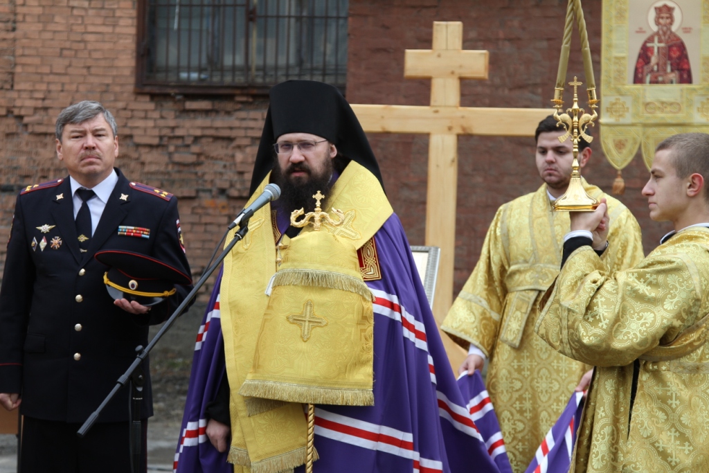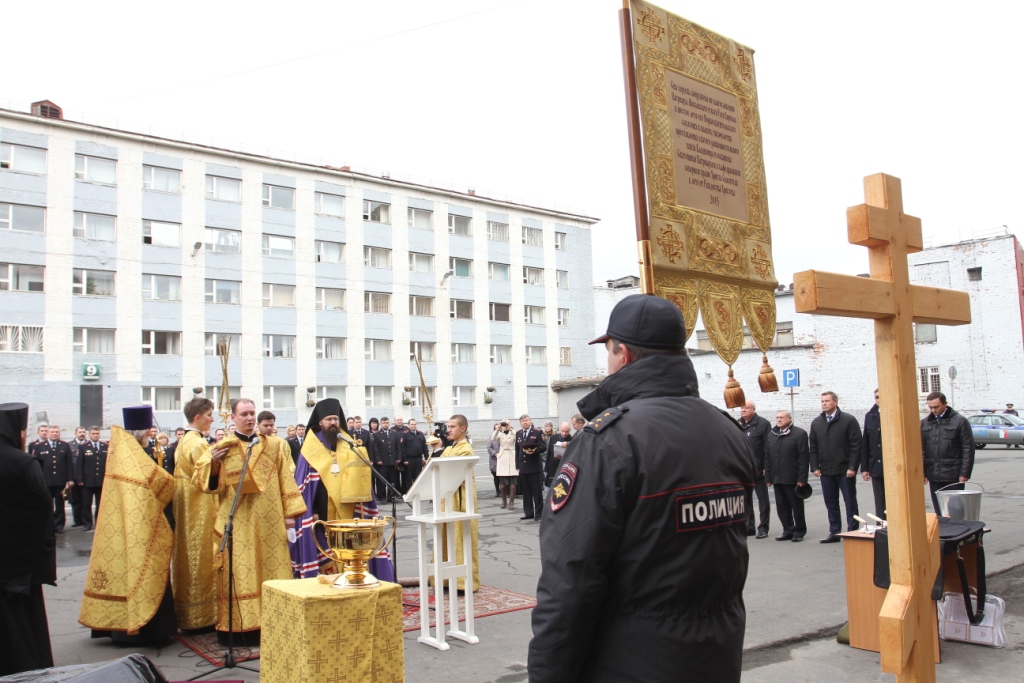 В завершении закладки камня епископ Норильский и Туруханский Агафангел преподнес в дар полицейским церковное знамя с изображением Святого равноапостольного князя Владимира, освященную Святейшим Патриархом Московским и всея Руси Кириллом и выразил уверенность, что хоругвь станет духовным щитом правоохранителей и, освещая путь к новым свершениям, будет способствовать успешному выполнению любых поставленных передстражами порядка задач.