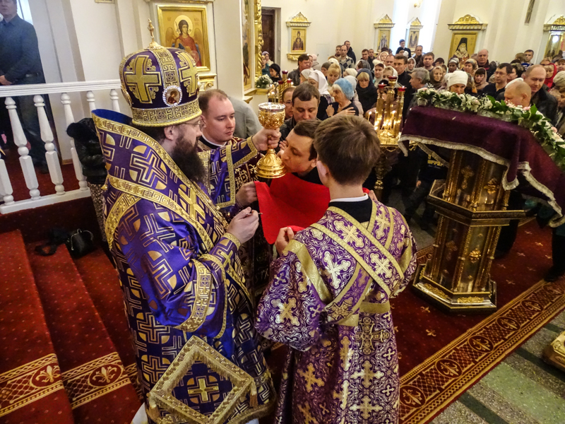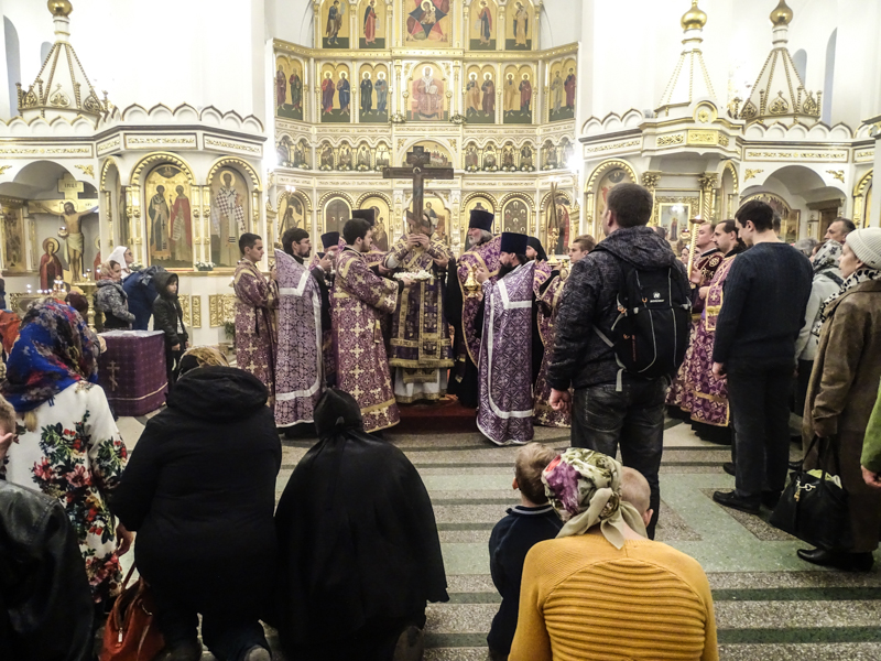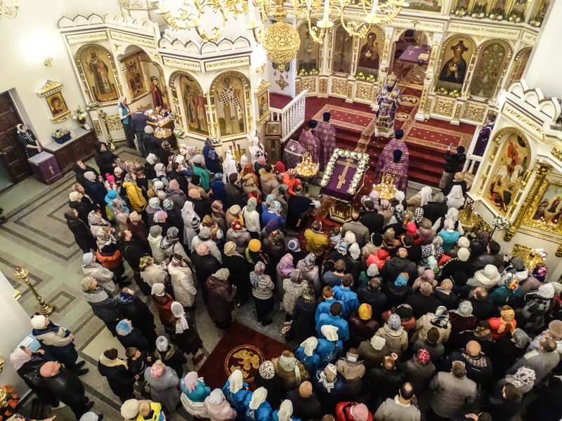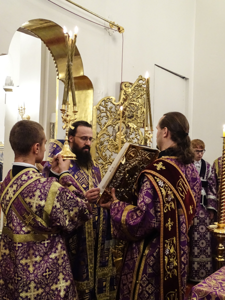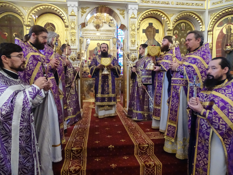 По окончании Литургии Архипастырь с духовенством и молящимися совершили поклонение Кресту.