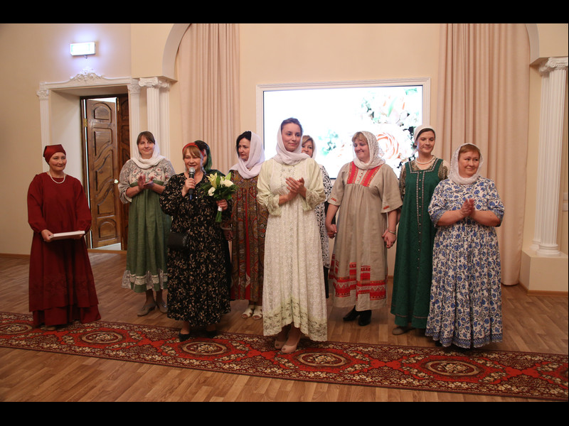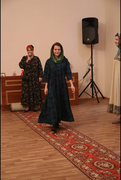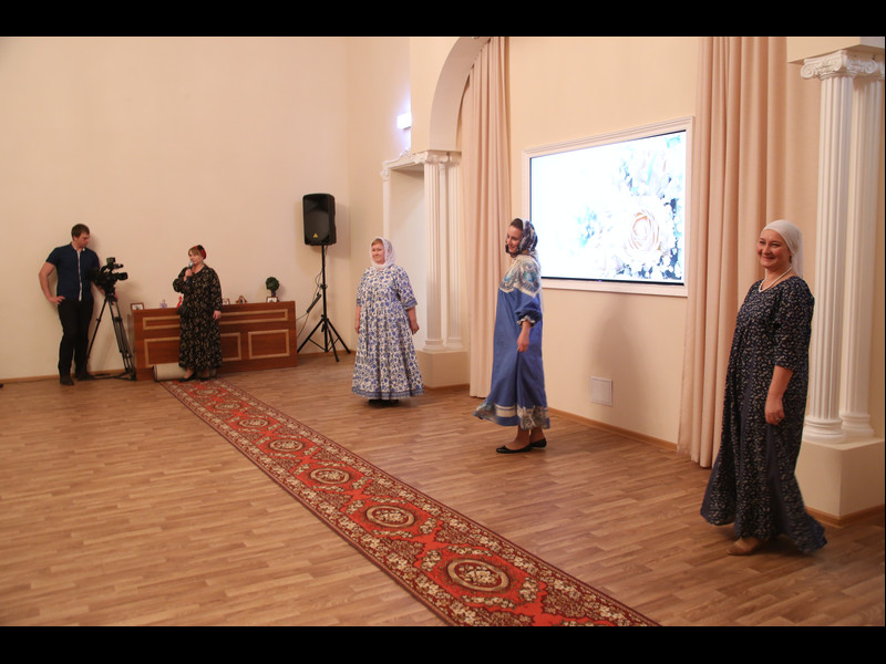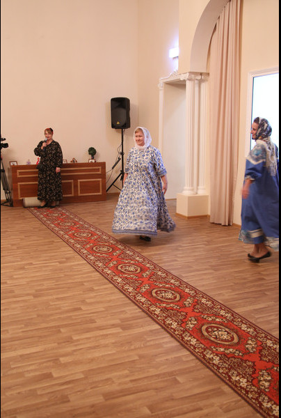 После небольшого перерыва дети отправились в трапезную пить чай, а для мам был приготовлен сюрприз: по приглашению епархии в Норильск приехал известный православный дизайнер женской одежды Елена Чернышева. Она привезла для показа свою коллекцию одежды, созданной по мотивам народного костюма, соединяющей в себе красоту и целомудрие, оригинальность и скромность, а потому уместную для посещения храма в дни праздников и торжественных богослужений.