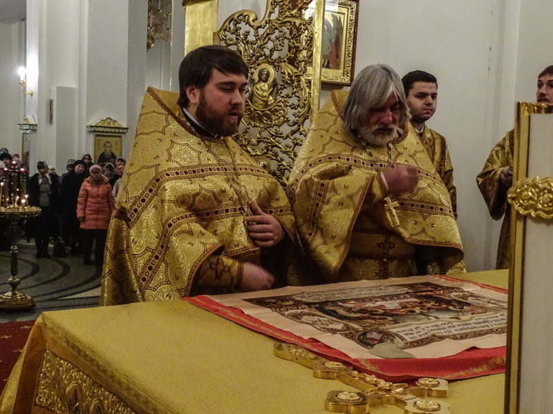 По окончании Богослужения священнослужители совершили славление перед иконой святителя Николая, Владыка прочитал молитву святому.
