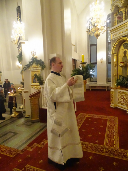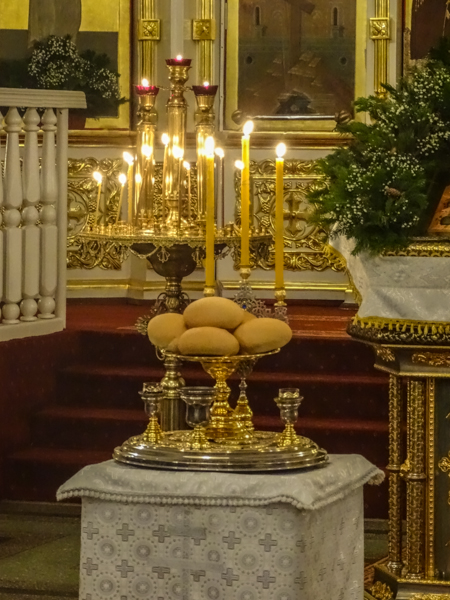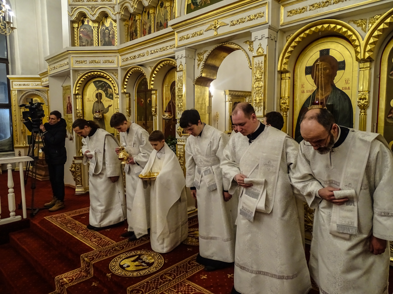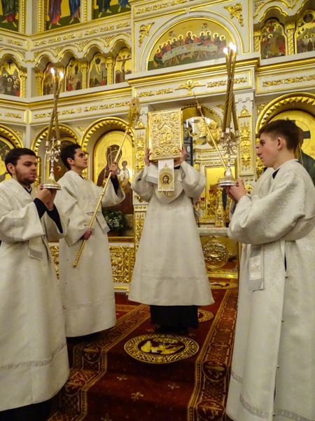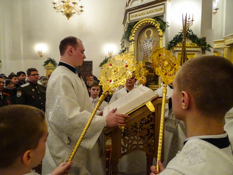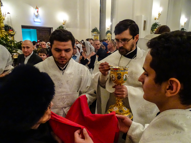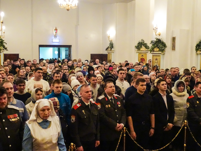 На ночной Божественной Литургии, стены собора были переполнены молящимися, среди которых присутствовали: Норильские казаки, сестры Милосердия, представители Молодой Гвардии и волонтеры Норильской епархии.