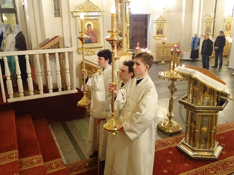 Его Преосвященству сослужили: секретарь Норильской епархии иеромонах Герман (Мельников), благочинный Норильского округа и ключарь кафедрального собора протоиерей Владимир Иванов, председатель епархиального отдела по взаимодействию с вооруженными силами протоиерей Димитрий Харцыз, клирики кафедрального собора.