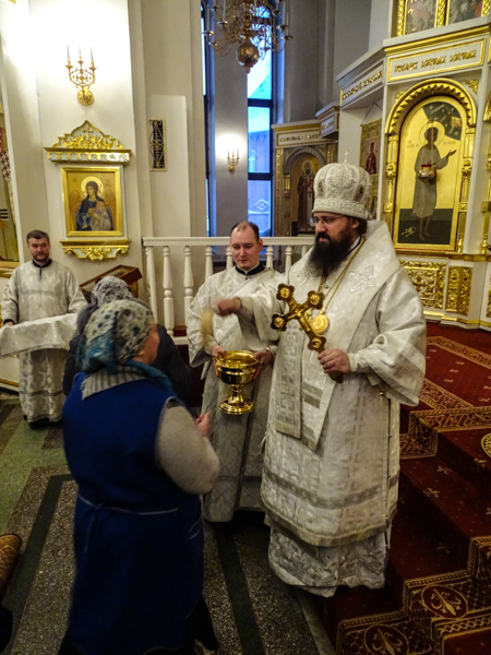 По окончании Литургии Василия Великого епископ Агафангел в сослужении духовенства совершил Великое освящение воды и окропил прихожан святой водой.