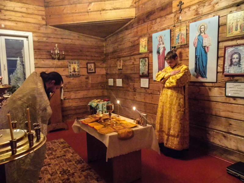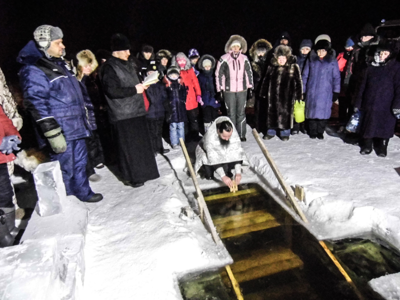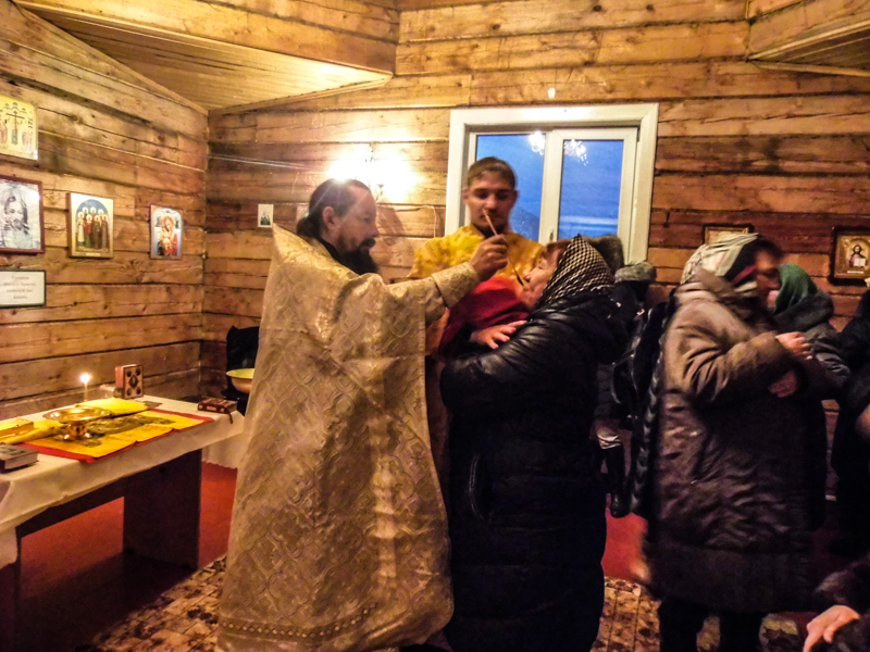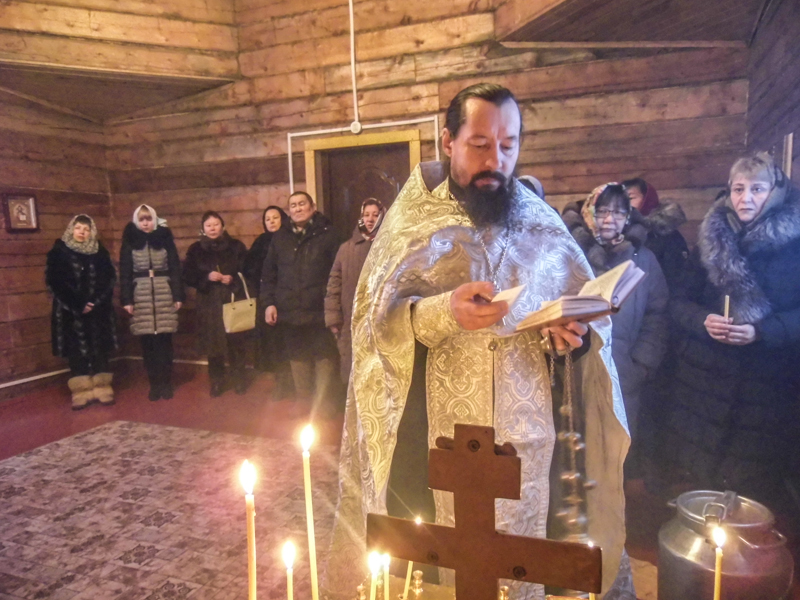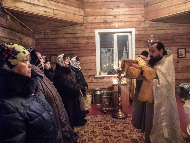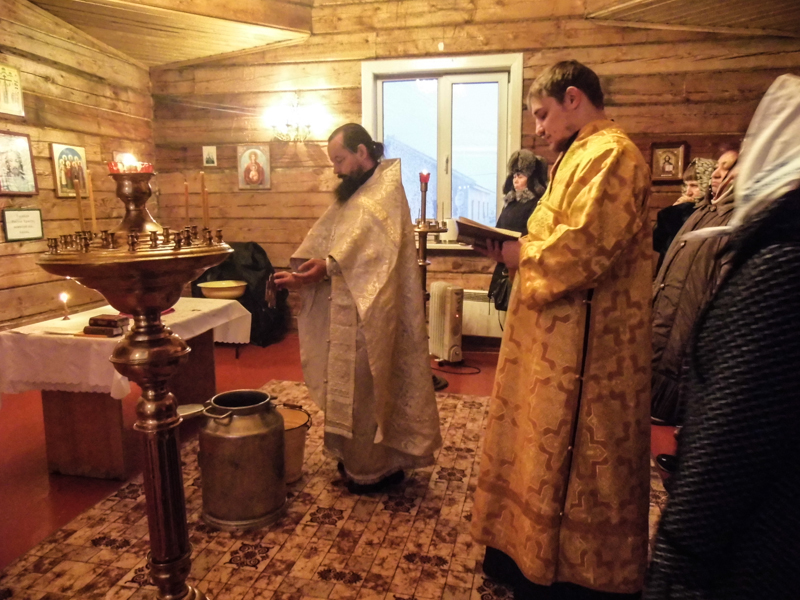 Штатный священник кафедрального собора иконы Божией Матери «Всех скорбящих Радость» города Норильска иерей Георгий Михайлов в день Навечерия Святого Богоявления совершил Божественную Литургию в часовне святых Жен Мироносец п. Носок, а по окончании провёл Чин Великого освящения воды. По многочисленным просьбам верующих отец Георгий в сослужении сопровождающего его диакона Сергия Харцыз посетили жилища местных жителей, а также поселковую администрацию и больницу, совершив везде Чин освящения.