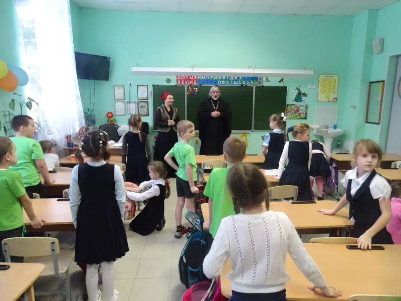 Так как день проведения урока совпал с Днем православной молодежи, то в память о знакомстве с первой книгой всем первоклассникам от молодежного отдела Норильской епархии Пучканева Анастасия подарила Православные буквари и сладости.