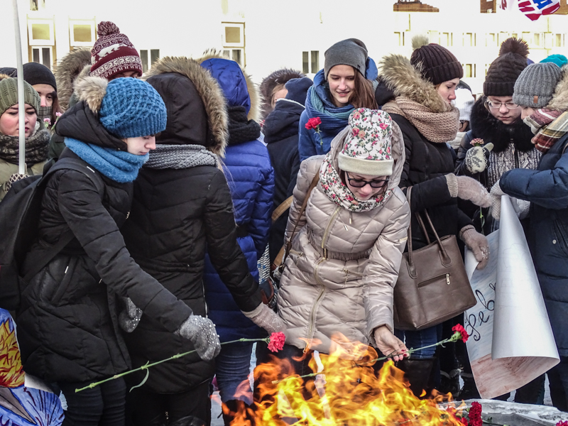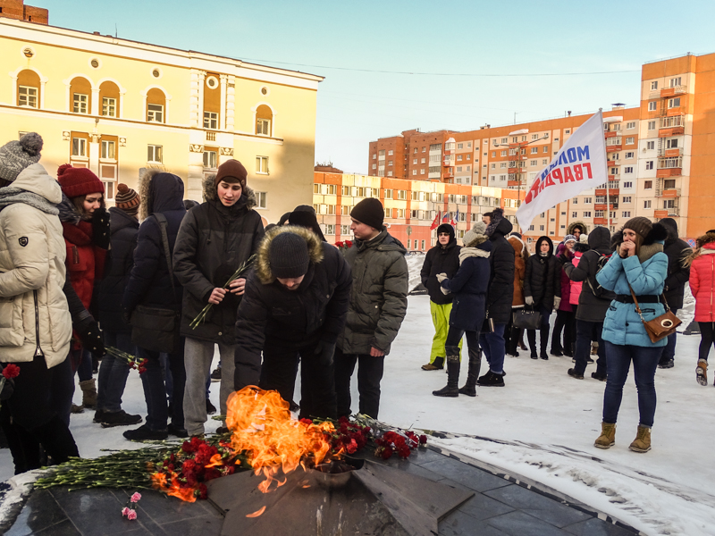 Возложить цветы на "Вечный огонь" пришло большое количество молодых людей. Несмотря на мороз и ледяной ветер, юноши и девушки почтили память погибших минутой молчания, после чего у мемориала были сделаны памятные фотографии.