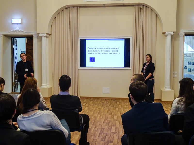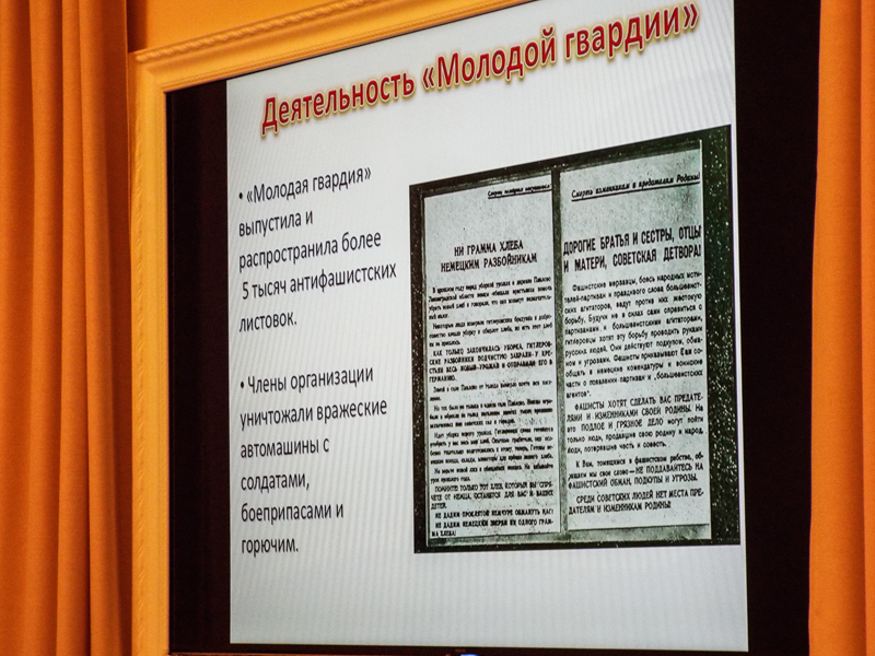 Началом сбора стало вступительное слово помощника руководителя отдела Норильской епархии по взаимодействию с силовыми структурами и правохранительными органами диакона Сергия Харцыз, после чего была представлена презентация, которая содержала в себе информацию о зарождении и развитии православия в городе Норильске, некотрые факты старой и новой истории Российской Федерации, а так же история рождения организации "Молодая гвария". Далее последовала занимательная викторина. На вопросы активно отвечали все собравшиеся, викторину провели так же ребята "молодогвардейцы".