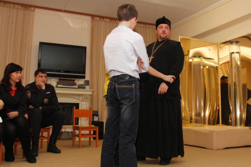 Руководитель отдела по взаимодействию с правоохранительными структурами Норильской епархии протоиерей Димитрий Харцыз, в прошлом проходивший службу в пограничных войсках, рассказал об истории и православной традиции русской армии, продемонстрировал ребятам автомат Калашникова и тубус от ручной противотанковой гранаты и даже научил мальчишек нескольким защитным приемам из русского рукопашного боя. Напоследок отец Димитрий подарил каждому ребенку иконку с благословением Патриарха Московского и всея Руси Кирилла.