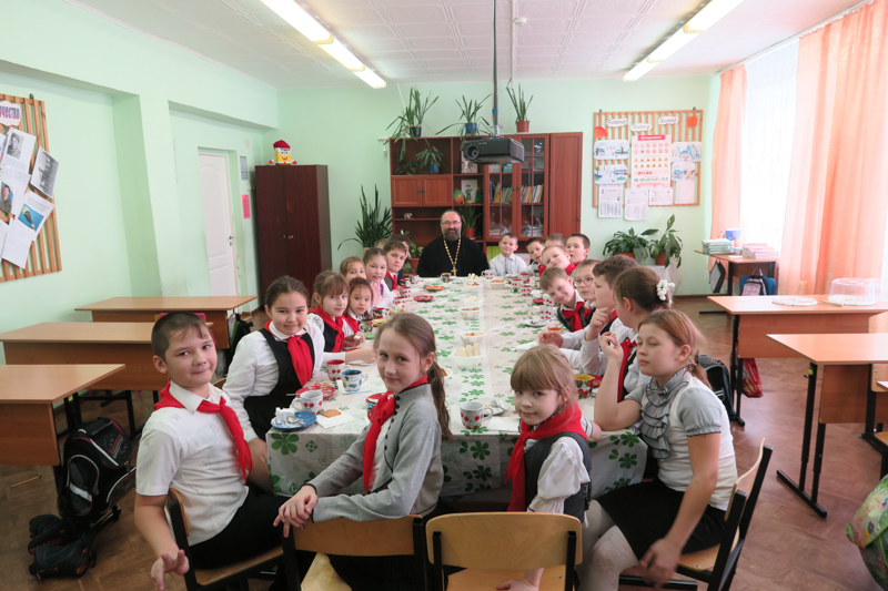 По окончании урока состоялось чаепитие на котором ребятами имели возможность задать священнику интересующие их вопросы. В конце беседы батюшка сфотографировался с учениками и благословил их на продолжения успешного учения в этом учебном году.