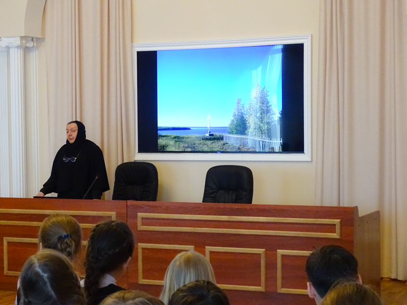 Тема беседы была посвящена монастырям, их значению в истории и культуре России. Монахиня Илариона, руководитель одного из епархиальных отделов, познакомила школьников с историей Свято-Троицкого Туруханского монастыря, расположенного на территории Норильской епархии, рассказала о его роли в освоении русскими первопроходцами Восточной Сибири.