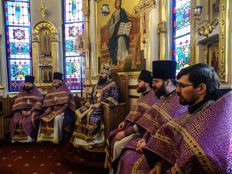 Его Преосвященству сослужили: секретарь Норильской епархии иеромонах Герман (Мельников); благочинный Норильского округа протоиерей Владимир Иванов; духовенство кафедрального собора.
