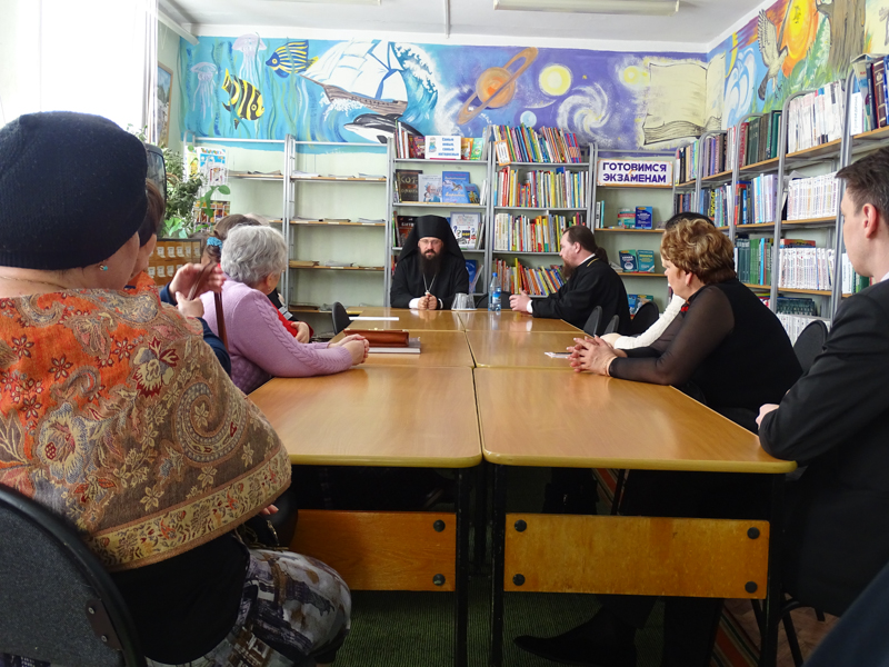 После богослужения в актовом зале районной библиотеки состоялась встреча правящего архиерея с общественностью поселка.