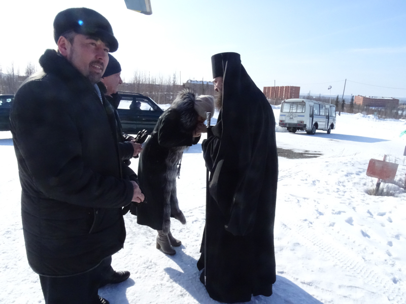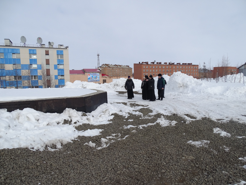 Владыка Агафангел встретился с представителями администрации поселка и Курейской ГЭС, а затем проследовал к месту строительства храма, осмотрел сооруженные фундаменты здания и обсудил организационные вопросы.