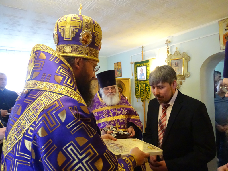 Владыка Агафангел обратился к присутствующим с архипастырским словом. Он поблагодарил прихожан, администрацию поселка, руководство Курейской ГЭС за помощь приходу и попечение о строительстве нового храма. Были вручены архиерейские грамоты и иконы с благословением Святейшего Патриарха Кирилла благодетелям светлогорского прихода.