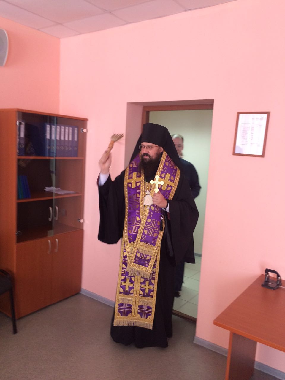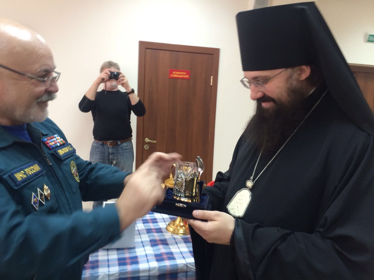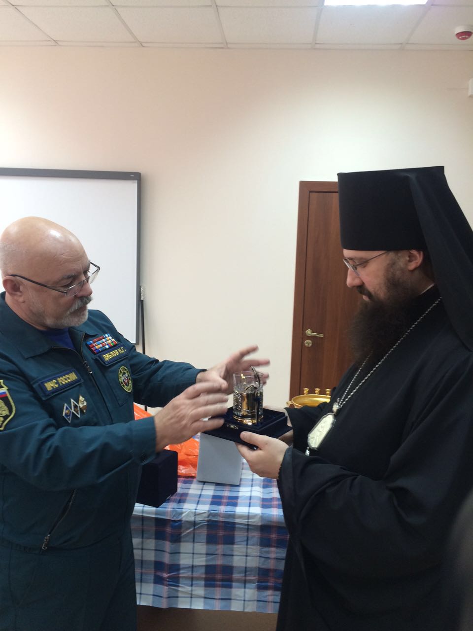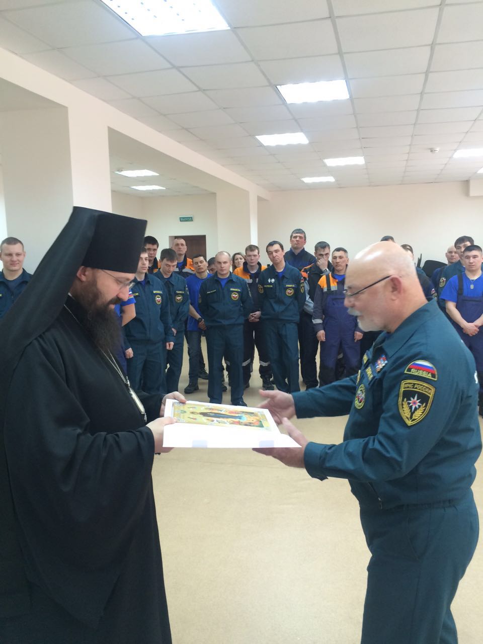 По окончании богослужения Владыка окропил святой водой помещения и рабочие кабинеты здания отряда. С приветственным словом к епископу Агафангелу обратился Николай Григорьевич Дяблов, который поблагодарил Владыку за визит и духовное оформление, и преподнёс Архипастырю памятный подарок.