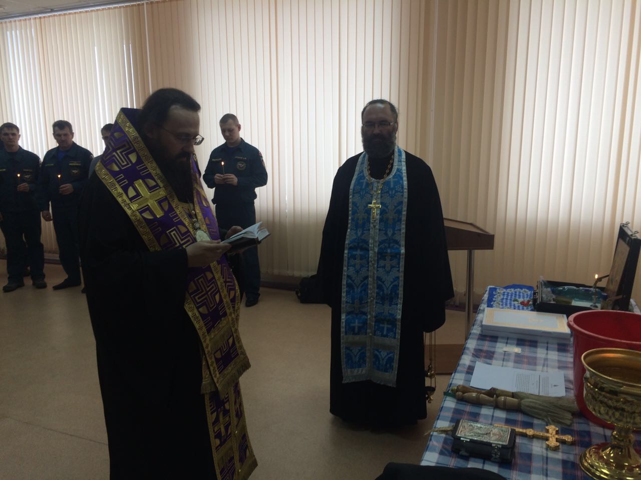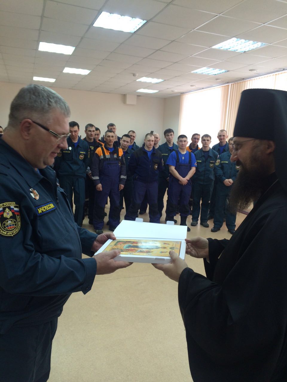 По просьбе руководство отряда Владыка совершил водосвятный молебен. За богослужением присутствовали: Советник отдела департамента пожарных спасательных сил и специальных формирований Российской Федерации Дяблов Николай Григорьевич; начальник Арктического поисково-спасательного отряда МЧС Саенко Андрей Валентинович; сотрудники арктического спасательного отряда.
