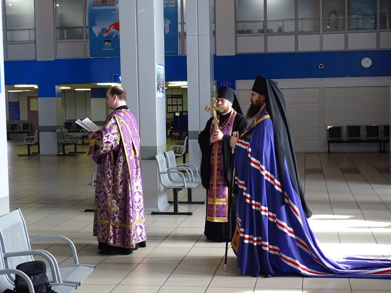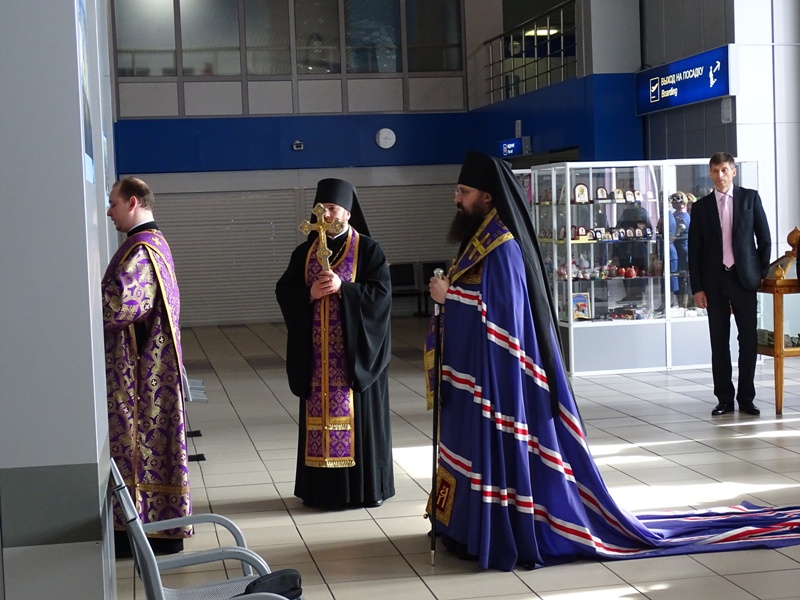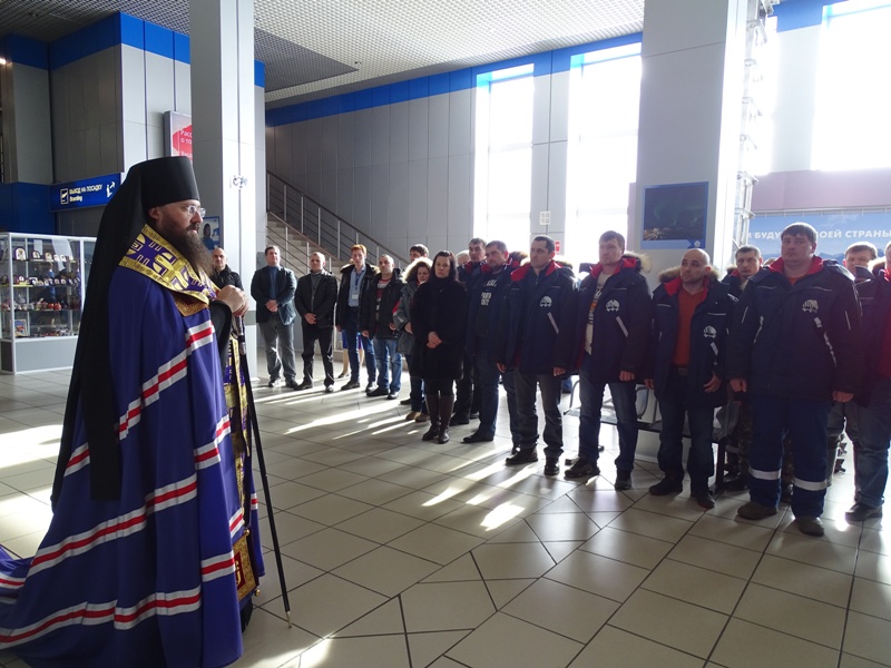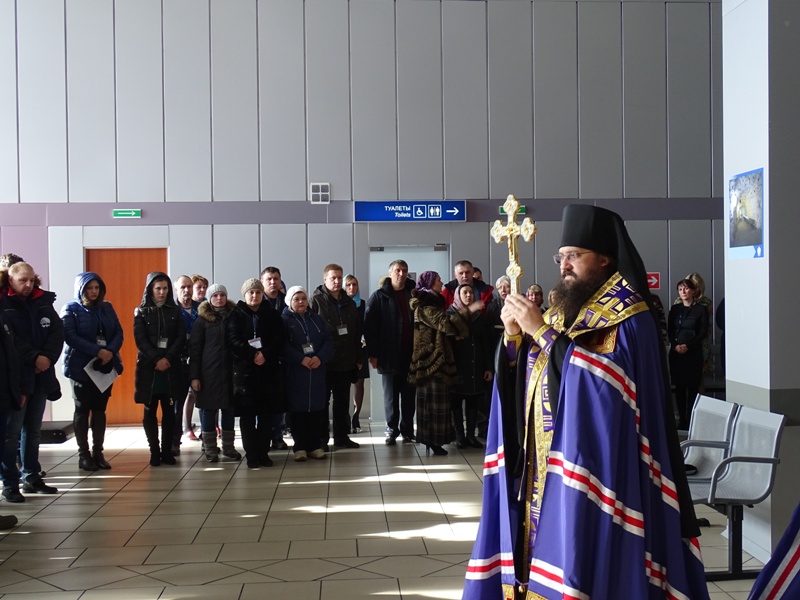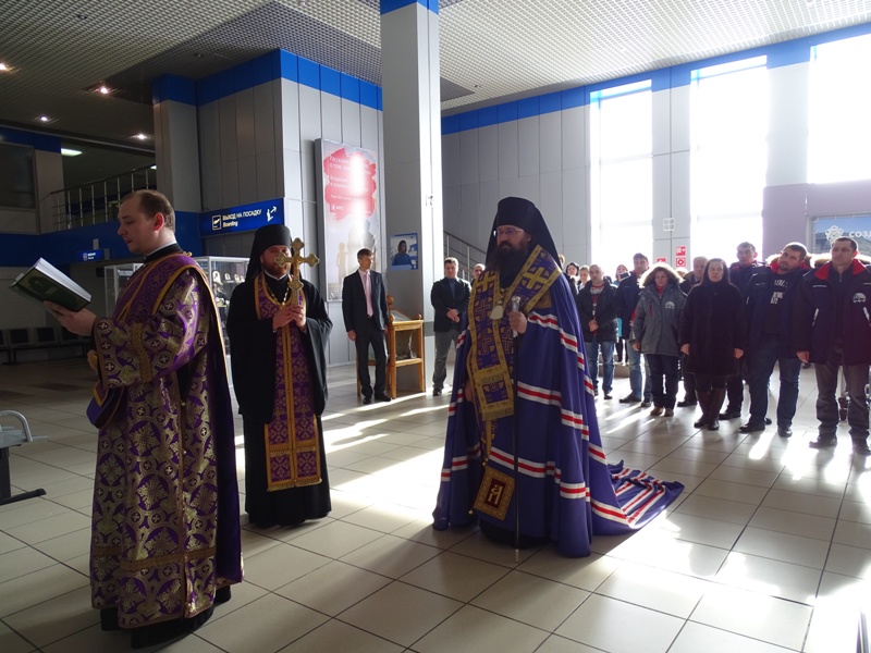Владыка совершил молебное пение призвания помощи Духа Святаго на всякое доброе дело. Его Преосвященству сослужил секретарь Норильской епархии иеромонах Герман (Мельников) и штатный диакон кафедрального собора города Норильска Алексий Трофимов. На молебне присутствовали: руководитель епархиального отдела по взаимодействию с вооруженными силами и правоохранительными структурами протоиерей Димитрий Харцых; генеральный директор аэропорта Никифоров Андрей Владимирович; сотрудники аэропорта и члены бригады, прибывшей в Норильск для проведения реконструкционных работ.