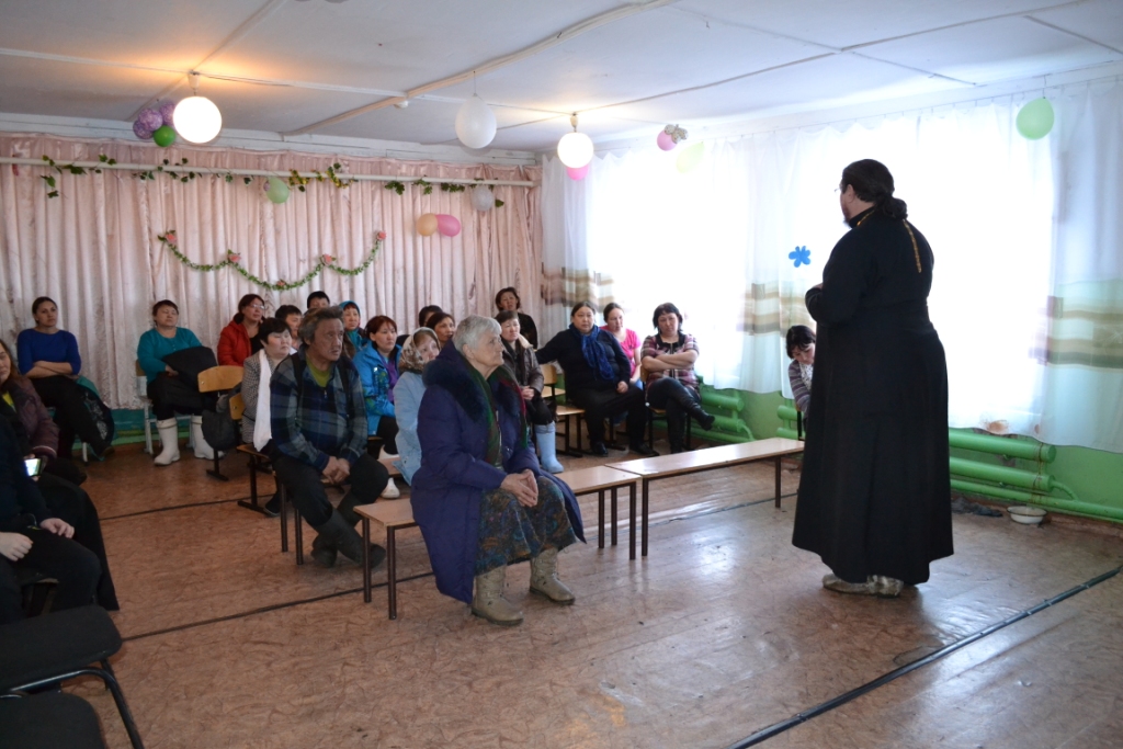 Вечером первого дня в актовом зале школы-интернат собрались местные жители для встречи со священником. Отец Евфимий рассказал о планах своего приезда, о духовной цели Великого поста. По окончании беседы был показан документальный фильм из серии «Земное и небесное» о Крещении Руси.