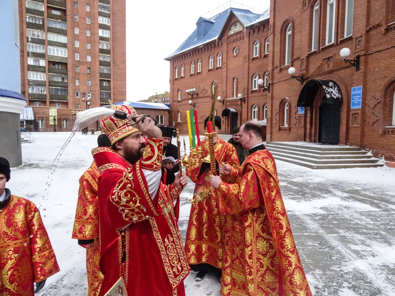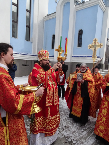Частицу огня доставил в кафедральный собор в честь иконы Божией Матери "Всех скорбящих Радость" города Норильска настоятель Свято-Троицкого мужского монастыря села Туруханск игумен Софроний (Семенов). После Божественной литургии Преосвященнейший Агафангел епископ Норильский и Туруханский с паствой встречали отца Софрония у ворот собора.
