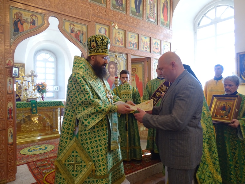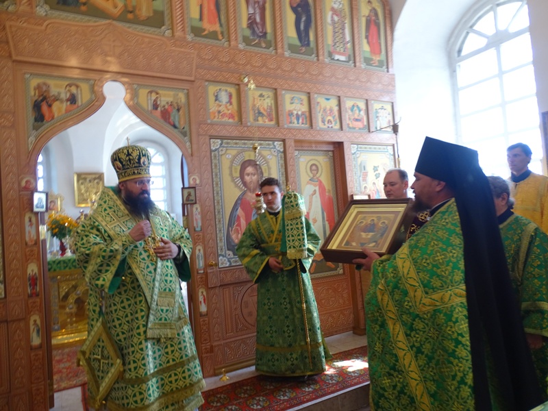 По окончании богослужении Архипастырь обратился к собравшимся со словами проповеди и поздравил братию обители и прихожан с престольным праздником. Владыка вручил Архиерейские грамоты Главе Туруханского района Шереметьеву Олегу Игоревичу и другим мирянам внесшим вклад в дело восстановления монастыря. Владыку приветствовал настоятель монастыря игумен Софроний. Игумен преподнес епископу Агафангелу икону Пресвятой Троицы и поблагодарил за радость совместной молитвы.