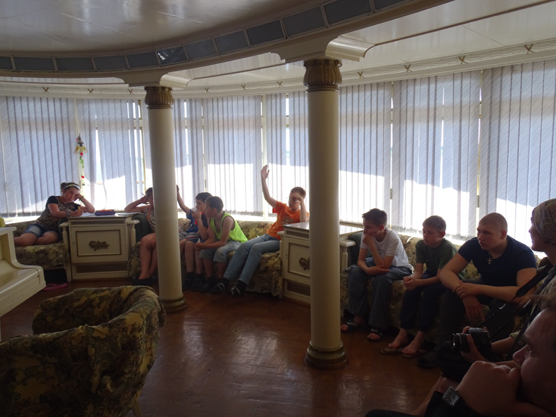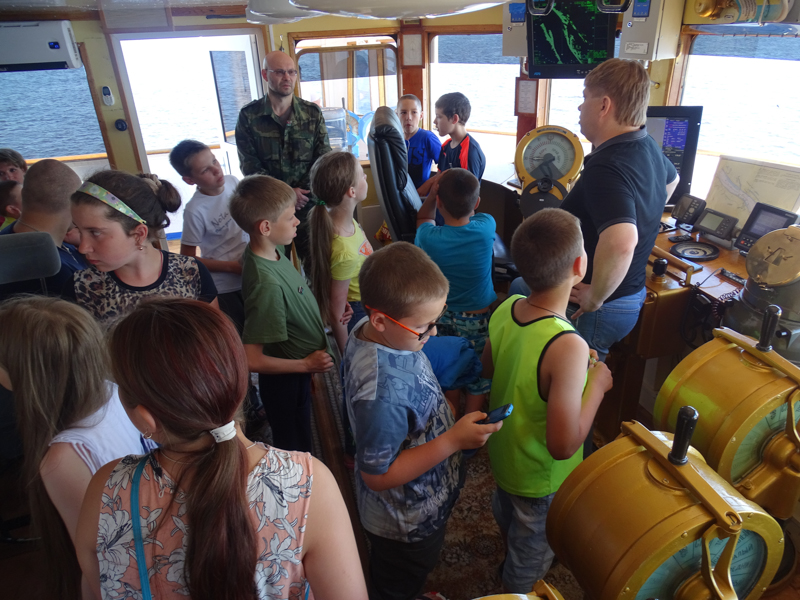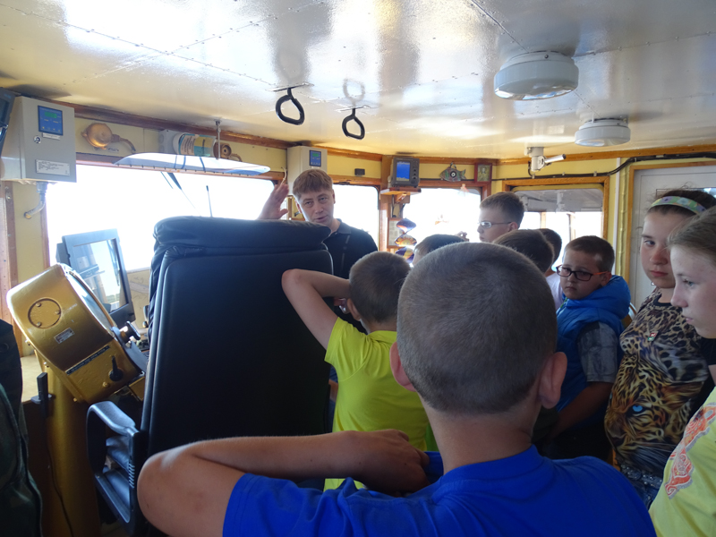 Капитан теплохода «Чкалов» гостеприимно принял многочисленную детскую делегацию и органнизовал экскурсию по теплоходу, рассказал о его устройстве и истории. Он даже пригласил ребят в капитанскую рубку и показал навигационные приборы, а также ответил на все вопросы.