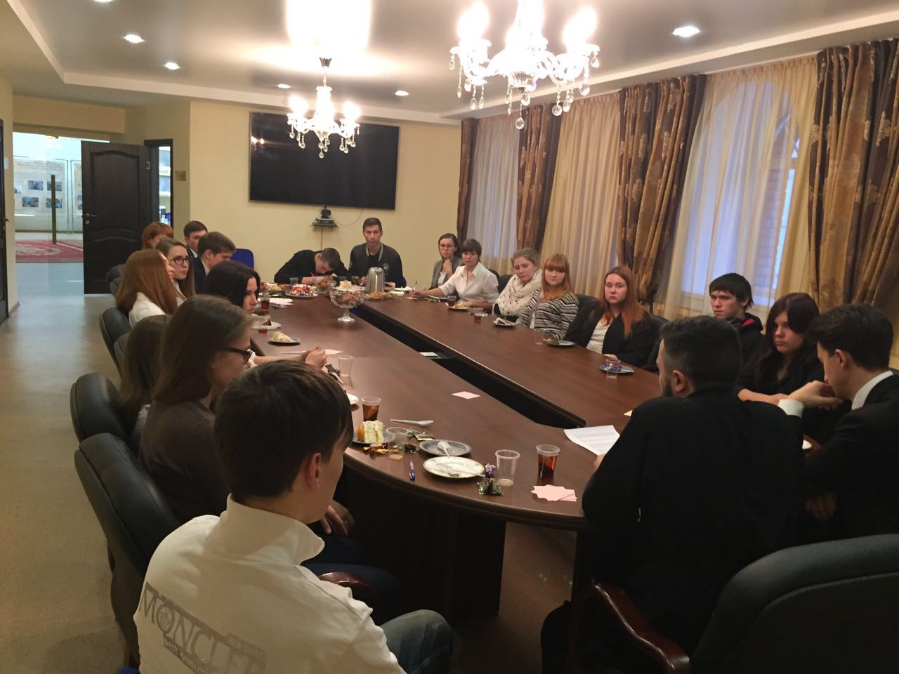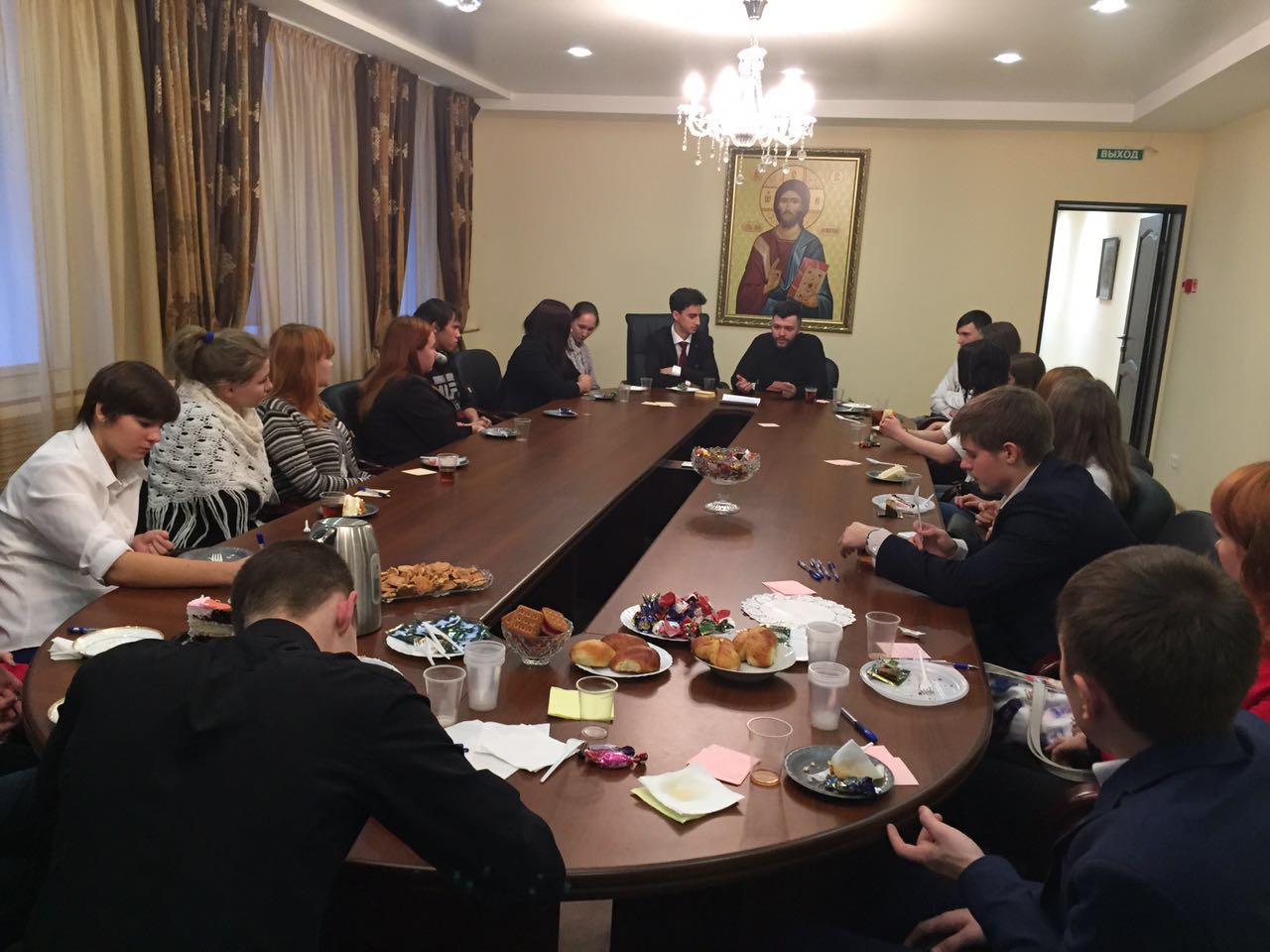 После молитвы руководитель епархиального Отдела по делам молодежи Норильской епархии Дмитрий Прохоров поприветствовал всех собравшихся молодых людей и прихожан и пригласил всех желающих в епархиальный Духовно-просветительский Центр, где состоялось молодежное чаепитие и беседа на тему «Наука и Религия».