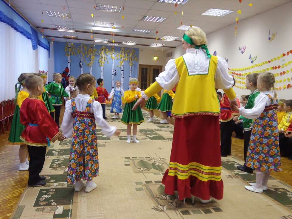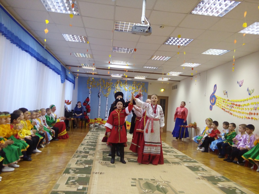 Мероприятие состояло из двух частей. Первая часть – праздничная – проходила в музыкальном зале, украшенном в цветовой гамме осени. Вторая часть – творческая – в Горнице детского сада. Отец Сергий Андреев рассказал детям о православном празднике Покрова Пресвятой Богородицы. Педагоги провели с ребятами русские народные игры: «Осень просим», «Кострома», «Золотые ворота». Дети познакомились с русскими народными поговорками и пословицами, исполнили песни «Во кузнице», «Прялица», разыграли потешки. С особым интересом дошкольники посмотрели выступление фольклорного ансамбля «Казачок». Помня пословицу «делу - время, потехе - час», дети отправились в Горницу, на мастер-класс «Покров-батюшка деревья укрыл», на котором «украсили» деревья белым снегом, используя в своей работе масляную пастель.