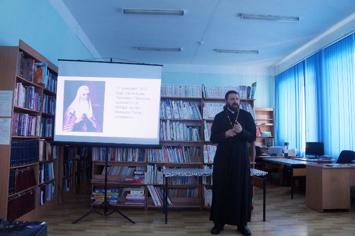 Директор библиотеки Наталья Сергеевна Сергеева рассказала собравшимся ребятам и взрослым об исторических событиях времен Смуты, победе народного ополчения и установлении государственного праздника. Рассказ о событиях того времени продолжил настоятель храма св. мч. Василия Мангазейского иерей Геннадий Дубинко, поведавший собравшимся о чудесном обретении Казанской иконы Божией Матери, её помощи в единении народа и заступничестве в борьбе за свое государство, за веру православную, о роли священномученика святейшего Патриарха Гермогена в этих событиях. О том, что возрождение отечества может начинаться не только с прихода к власти мудрых правителей, но и с пробуждения народного самосознания, обращения простых людей к истинным идеалам и ценностям. В завершении мероприятия ребята получили памятные буклеты.