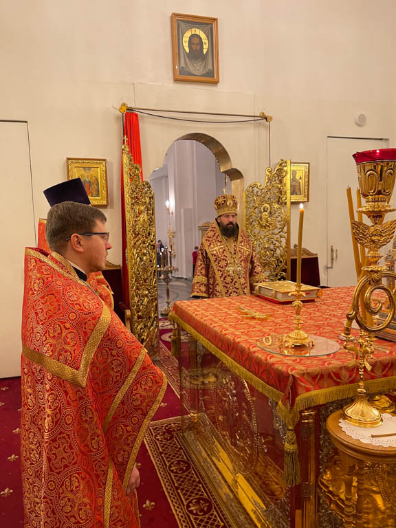 На кануне Архипастырь совершил Всенощное бдение в кафедральном соборе в честь иконы Божией Матери «Всех скорбящих Радость» города Норильска.