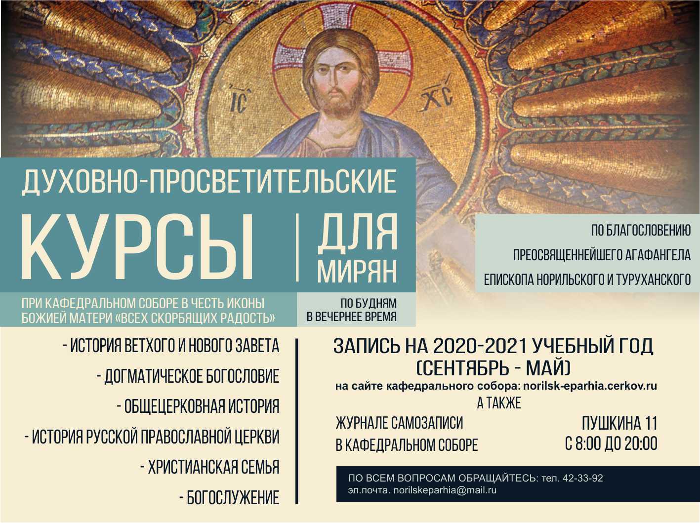 28 мая 2020 года, в праздник Вознесения Господня, Преосвященнейший Агафангел, епископ Норильский и Туруханский, совершил Божественную литургию в кафедральном соборе в честь иконы Божией Матери «Всех скорбящих Радость» города Норильска.