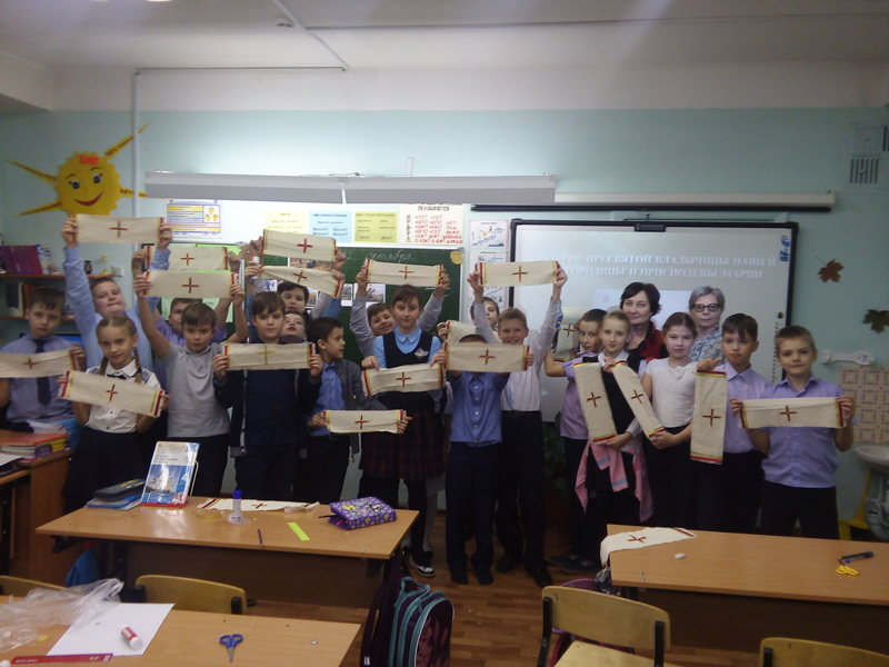 12 октября 2018 года в преддверии праздника Покров Пресвятой Богородицы, в общеобразовательной гимназии №4 в рамках курса «Основы религиозной культуры и светской этики» были проведены уроки для учащихся 4 классов. Педагоги Отдела религиозного образования и катехизации Норильской епархии рассказали детям историю праздника.