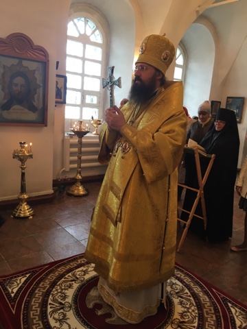 Его Преосвященству сослужил штатный священник Введенского храма иерей Роман Шагиев. За богослужением молились сотрудники Епархиального управления, сопровождающие Управляющего епархией.