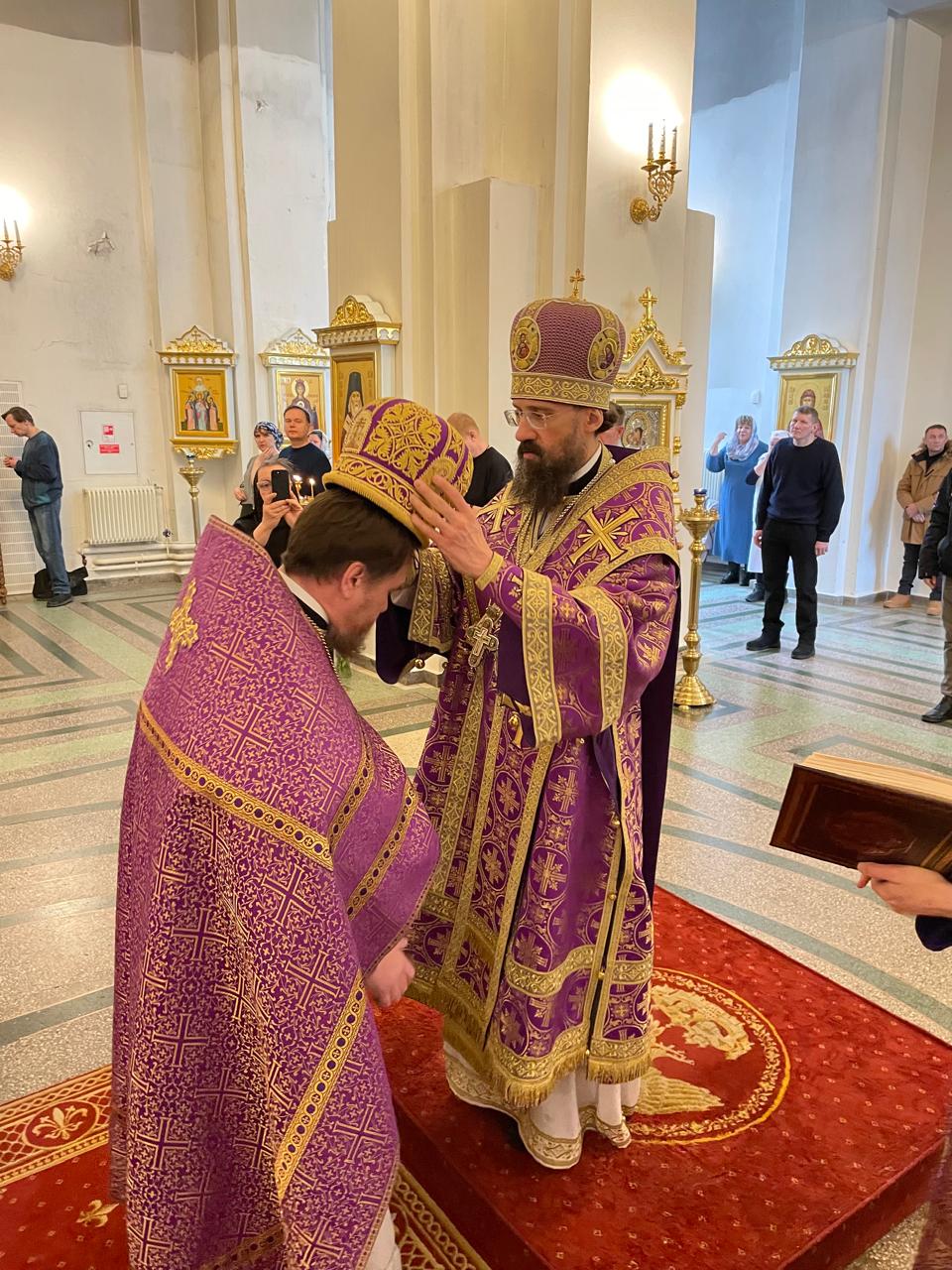 Его Преосвященству сослужили: избранный во епископа Нарьян-Марского и Мезенского клирик Норильской епархии игумен Софроний (Семенов); заведующий канцелярией Норильского епархиального управления, благочинный кафедрального собора иконы Божией Матери «Всех скорбящих Радость» города Норильска иерей Димитрий Прохоров; духовенство собора.