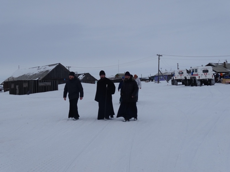 По окончании Литургии Преждеосвященных Даров во Введенском храме города Дудинки, Управляющий Норильской епархией с сопровождающим его духовенством отправился на трэколах в Усть-енисейский район Таймырского полуострова.