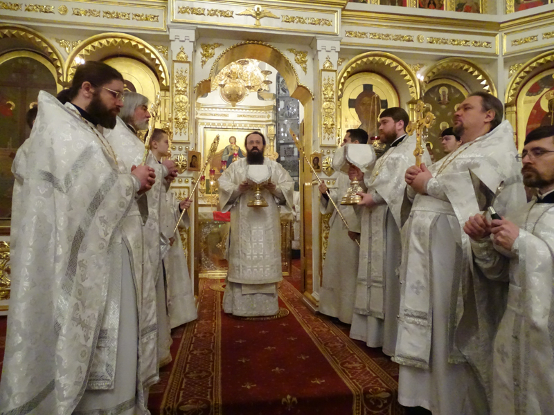 Его Преосвященству сослужили: секретарь Норильской епархии иеромонах Герман (Мельников); благочинный Норильского округа и ключарь Кафедрального собора протоиерей Владимир Иванов; председатель епархиального отдела по вопросам взаимодействия с Вооруженными Силами протоиерей Димитрий Харцыз; штатные клирики кафедрального собора.