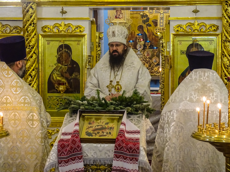 Его Преосвященству сослужили: секретарь епархии иеромонах Герман (Мельников), благочинный Таймырского округа протоиерей Георгий Ицков, штатные клирики Введенского храма.