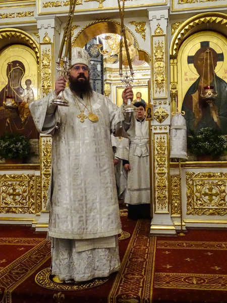 Его Преосвященству сослужили: секретарь Норильской епархии иеромонах Герман (Мельников), благочинный Норильского округа и ключарь кафедрального собора протоиерей Владимир Иванов, клирики кафедрального собора.