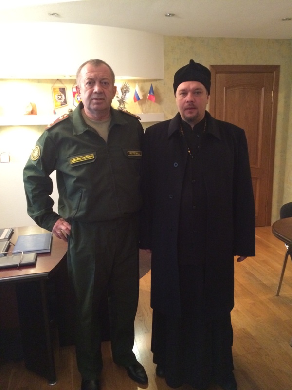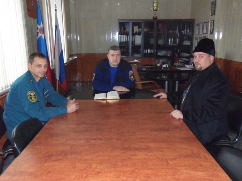14 октября 2014 года, в праздник Покрова Пресвятыя Владычицы нашей Богородицы и присно Девы Марии, председатель отдела по взаимодействию с вооруженными силами и правоохранительными органами протоиерей Димитрий Харцыз встретился с сотрудниками министерства чрезвычайных ситуаций. В частности о. Димитрий провёл рабочее совещание с начальником и заместителем начальника ФГКУ из 7-го отряда ФПС по Красноярскому краю Лиходеевым Борисом Дмитриевичем и Бочкаревым Алексеем Владимировичем. По окончании совещания о. Димитрий поздравил сотрудников отряда с праздником Покрова Пресвятой Богородицы, а также ответил на многочисленные вопросы присутствующих.