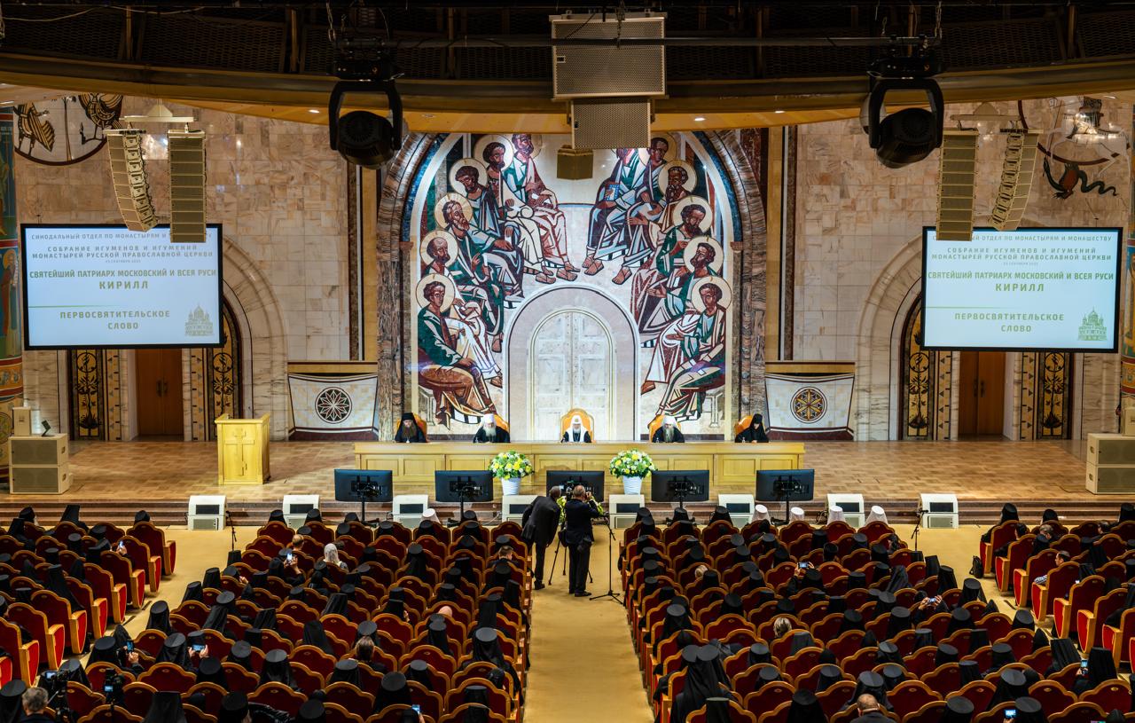 23 сентября 2025 года в Зале церковных соборов кафедрального соборного Храма Христа Спасителя в Москве Святейший Патриарх Московский и всея Руси Кирилл возглавил работу Собрания игуменов и игумений монастырей Русской Православной Церкви.